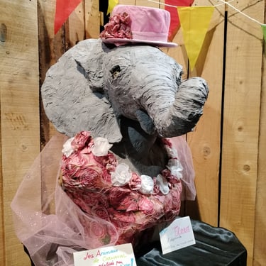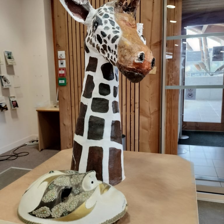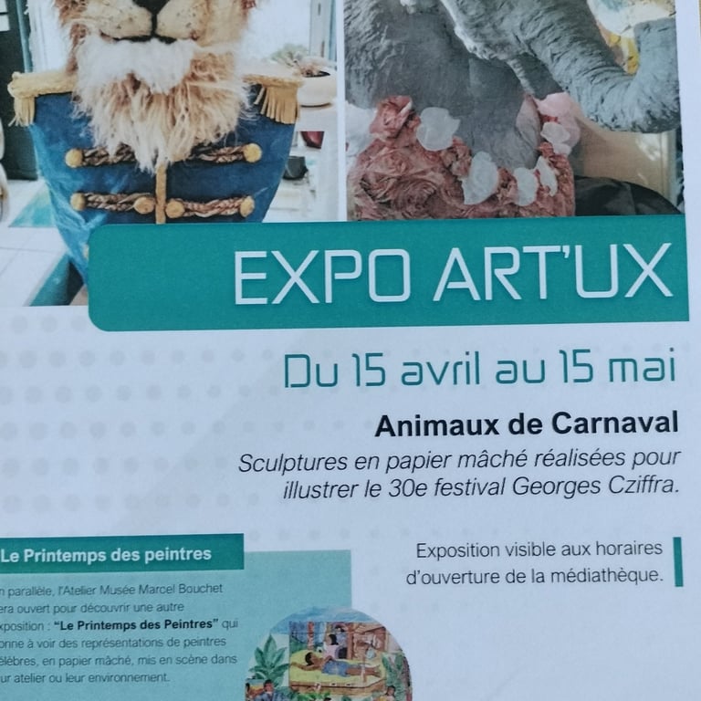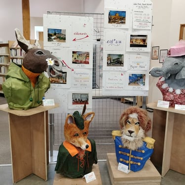 Sur le théme du Carnaval des Animaux de Camille St Saens, nous exposons des bustes d'animaux de Carnaval confectionnés ,par notre atelier, en argile de papier.