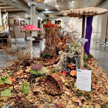 Exposition Vente de peintures et céramiques dans un décor automnal de champignons géants et de courges...